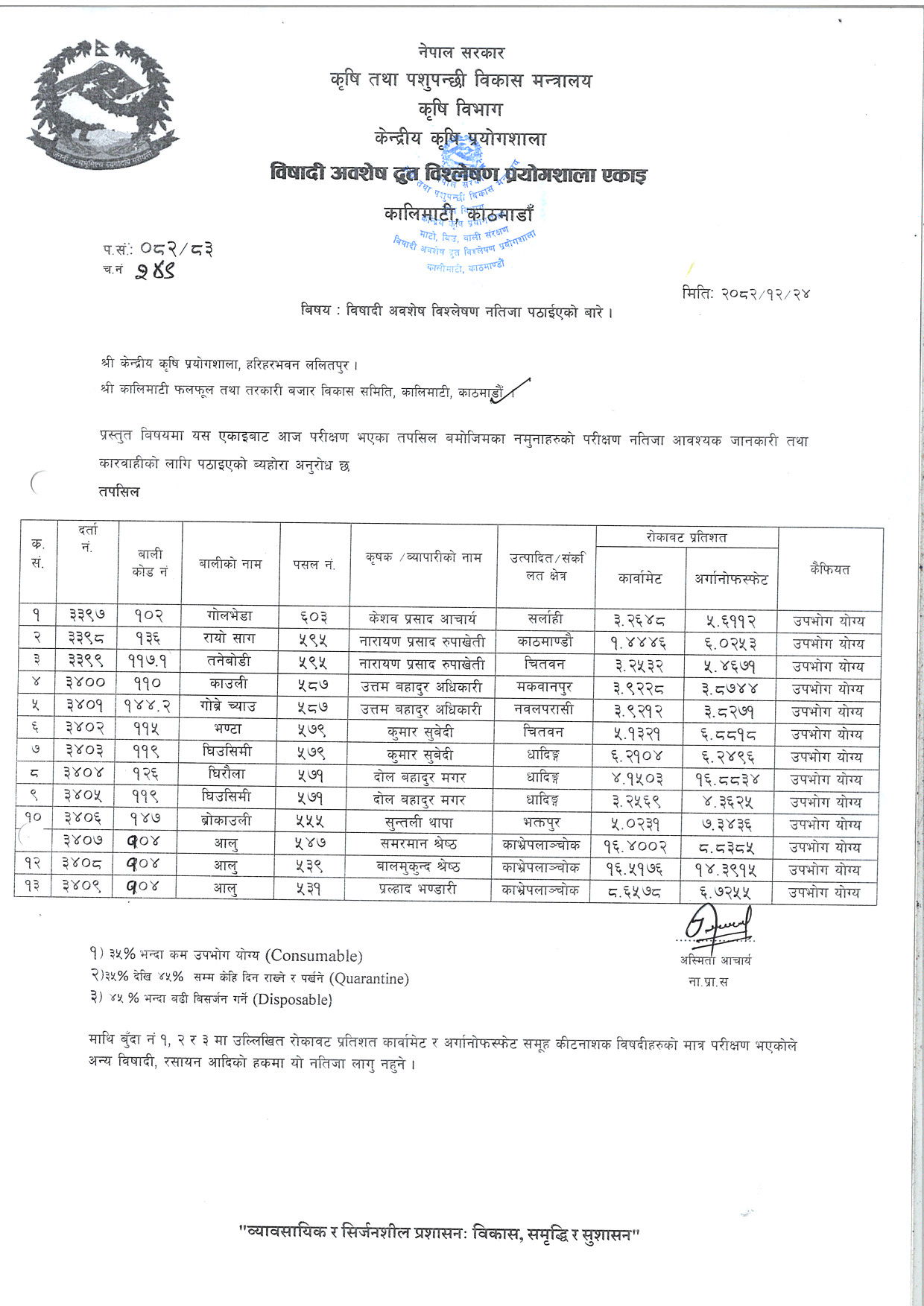 विषादी अवशेष द्रुत विश्लेषण नतिजा २०८३/१/०४