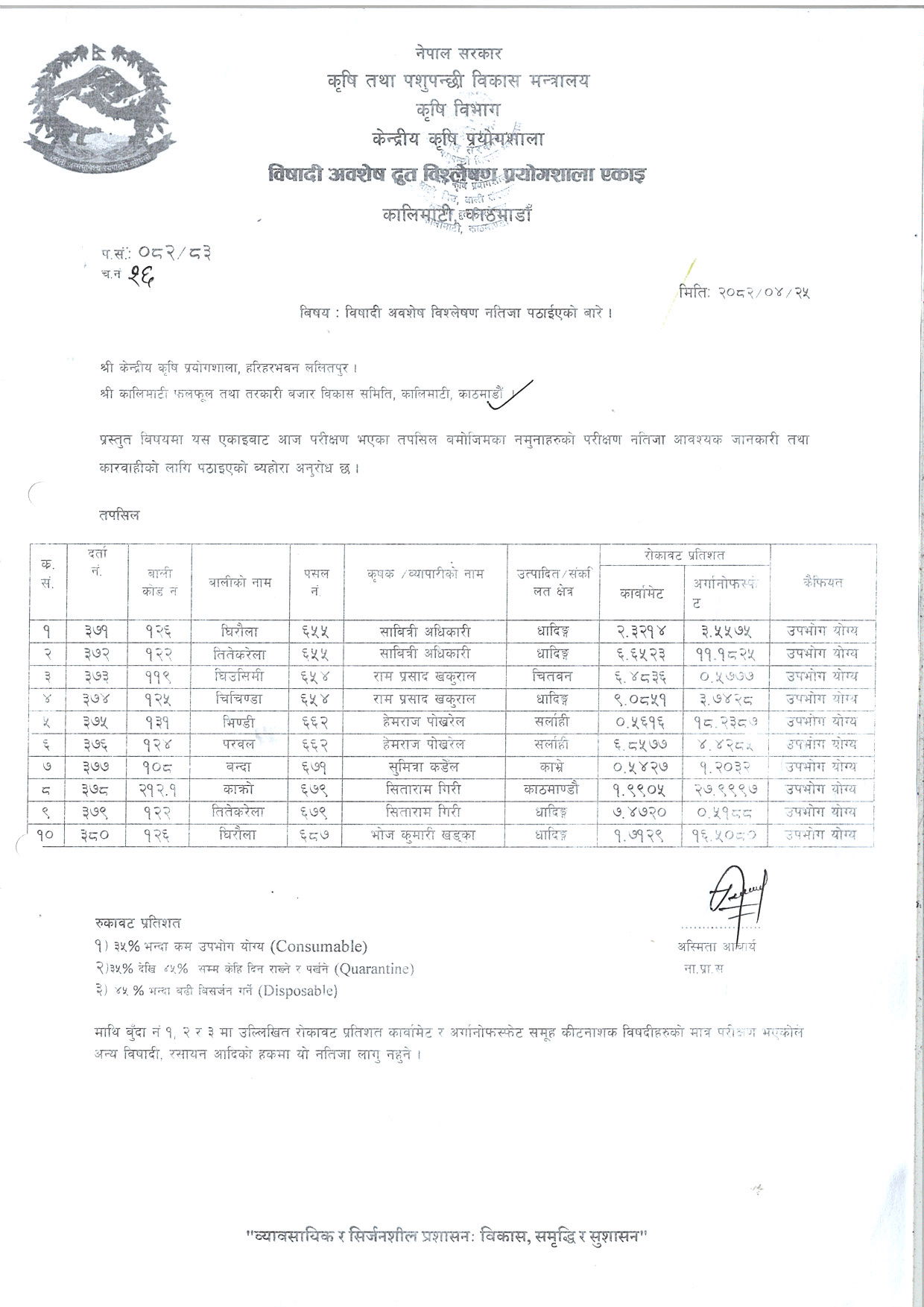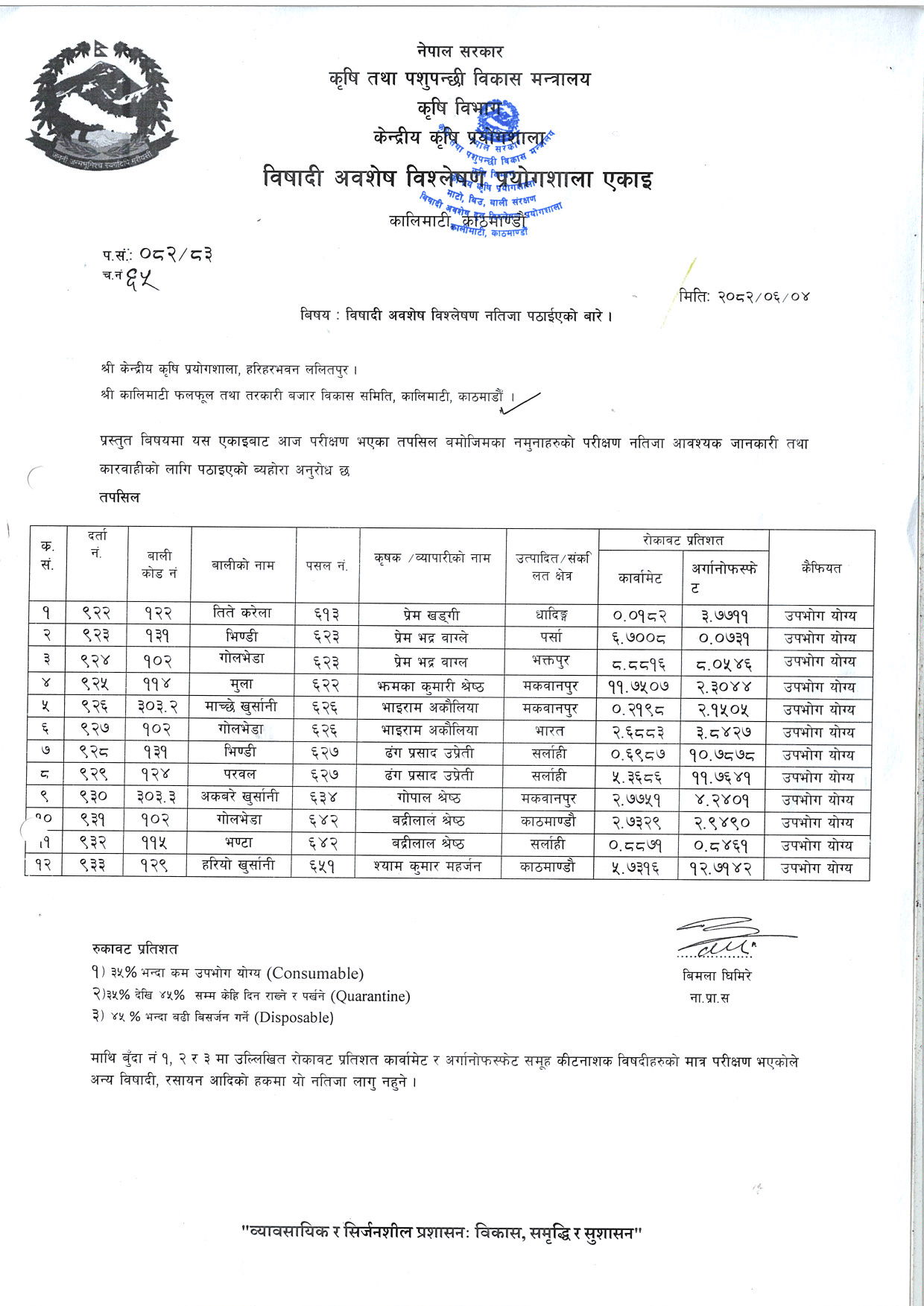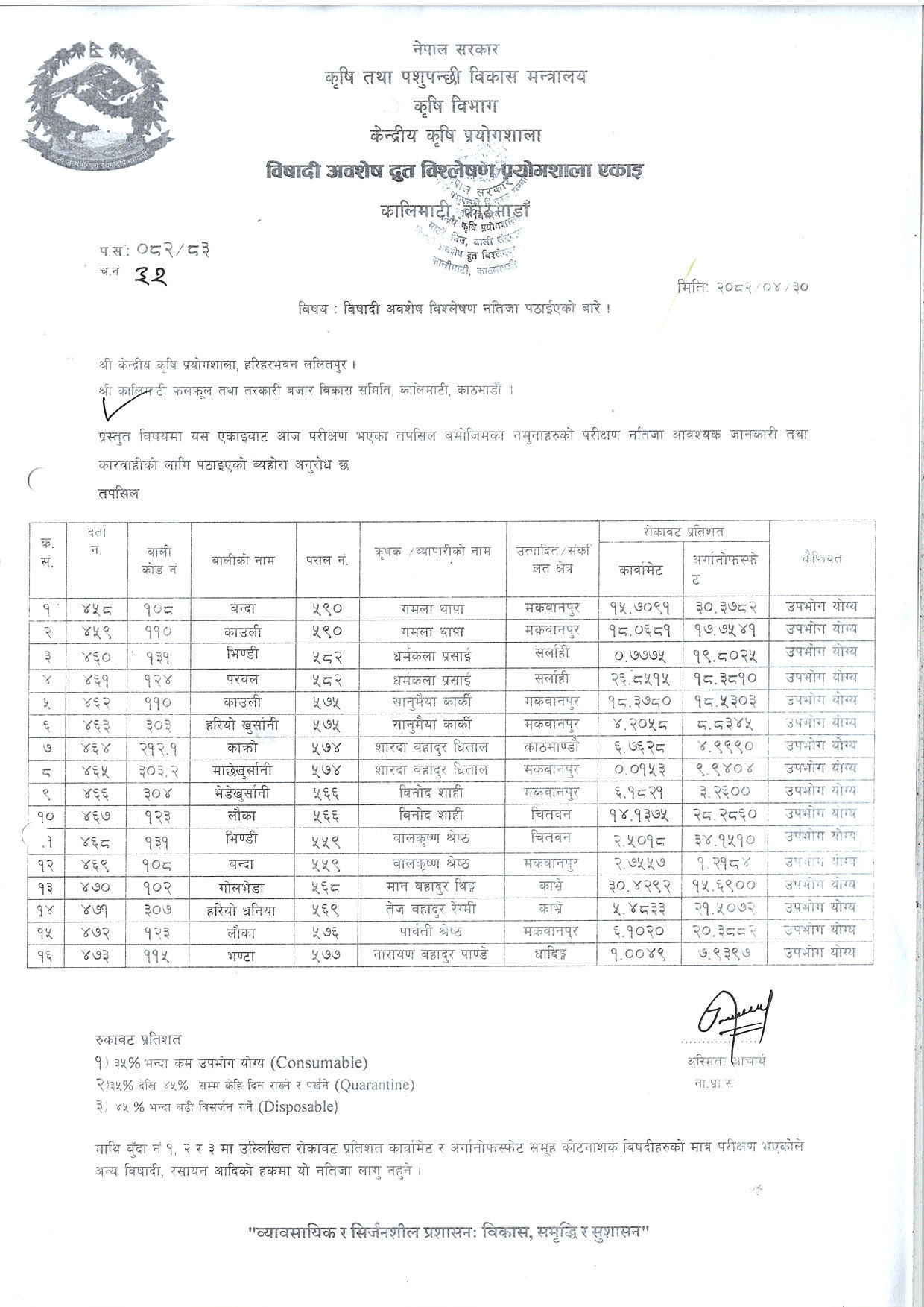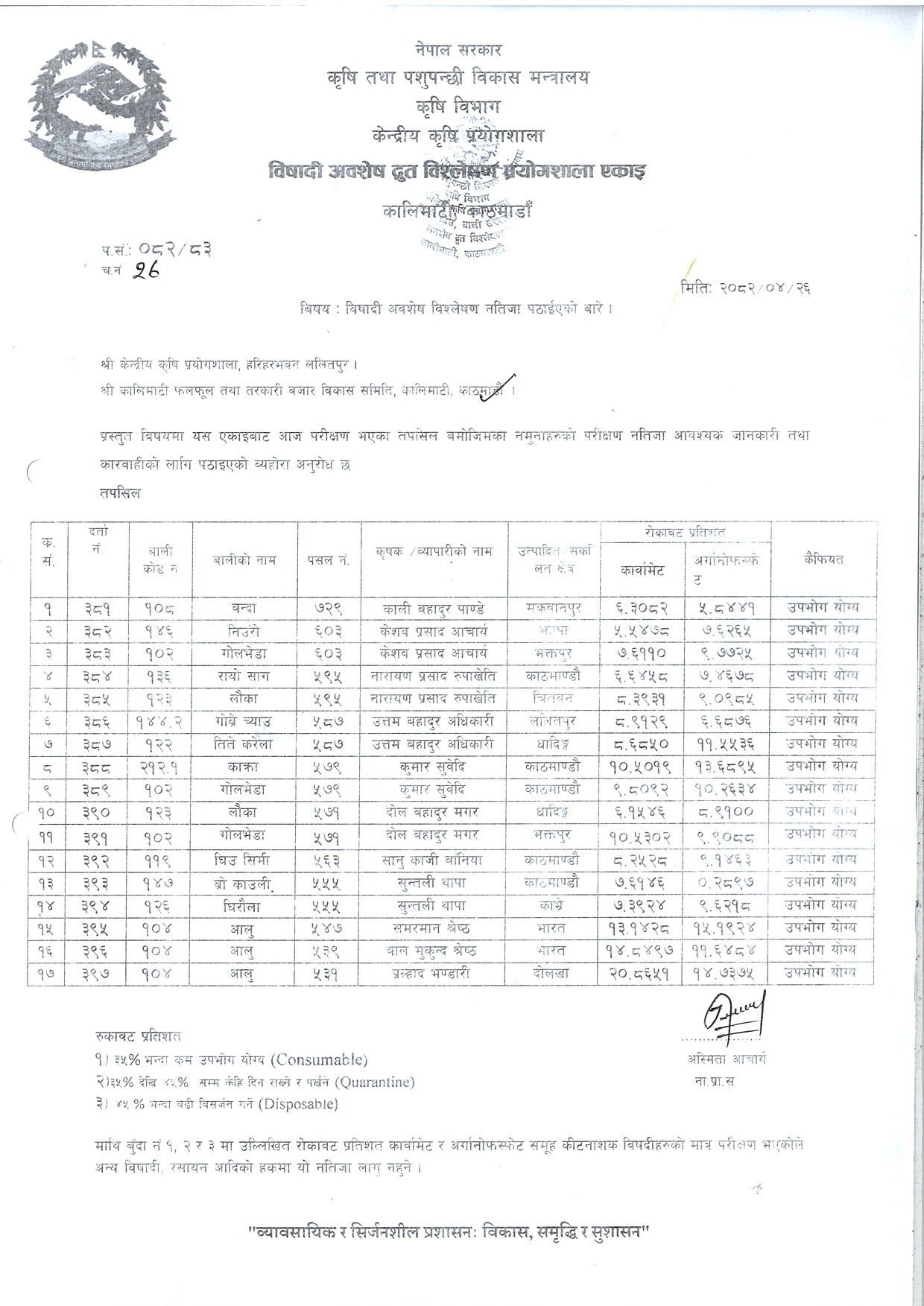 ३२ | विषादी अवशेष द्रुत विश्लेषण नतिजा २०८२/५/१४ | सूचना हेर्नुहोस् | वि.सं. भदौ १४, २०८२ | डाउनलोड गर्नुहोस् |