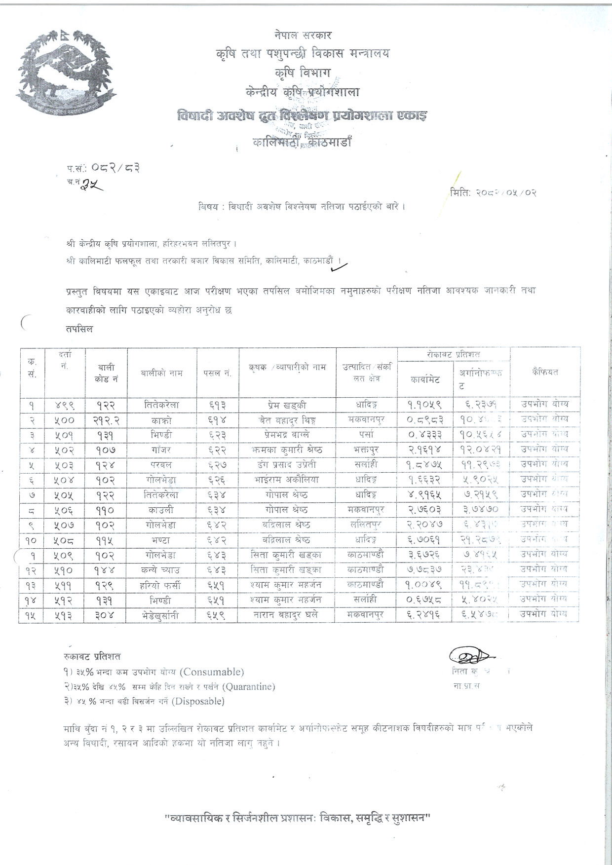 ५५ | विषादी अवशेष द्रुत विश्लेषण नतिजा २०८२/४/२२ | सूचना हेर्नुहोस् | वि.सं. साउन २२, २०८२ | डाउनलोड गर्नुहोस् |