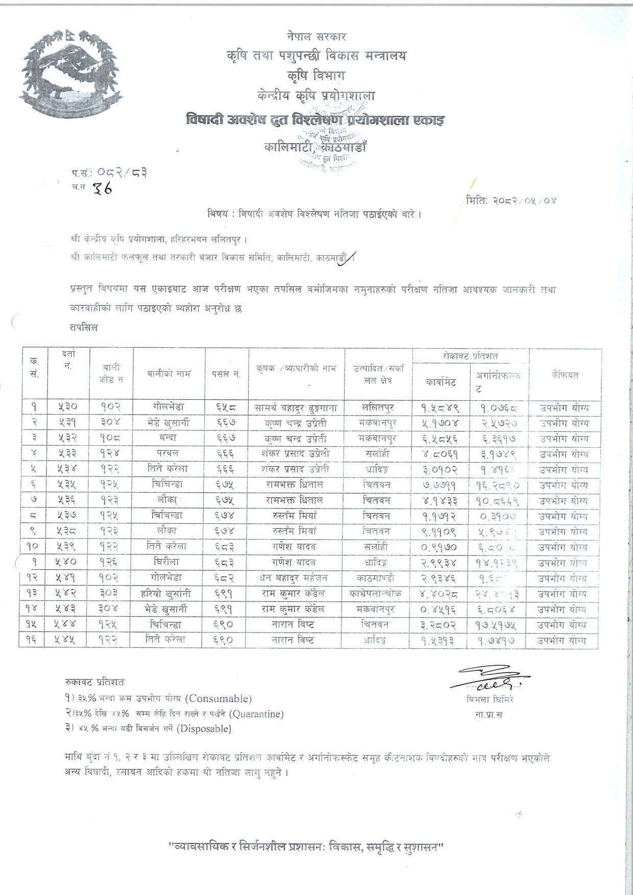 ३६ | विषादी अवशेष द्रुत विश्लेषण नतिजा २०८२/५/१० | सूचना हेर्नुहोस् | वि.सं. भदौ १०, २०८२ | डाउनलोड गर्नुहोस् |