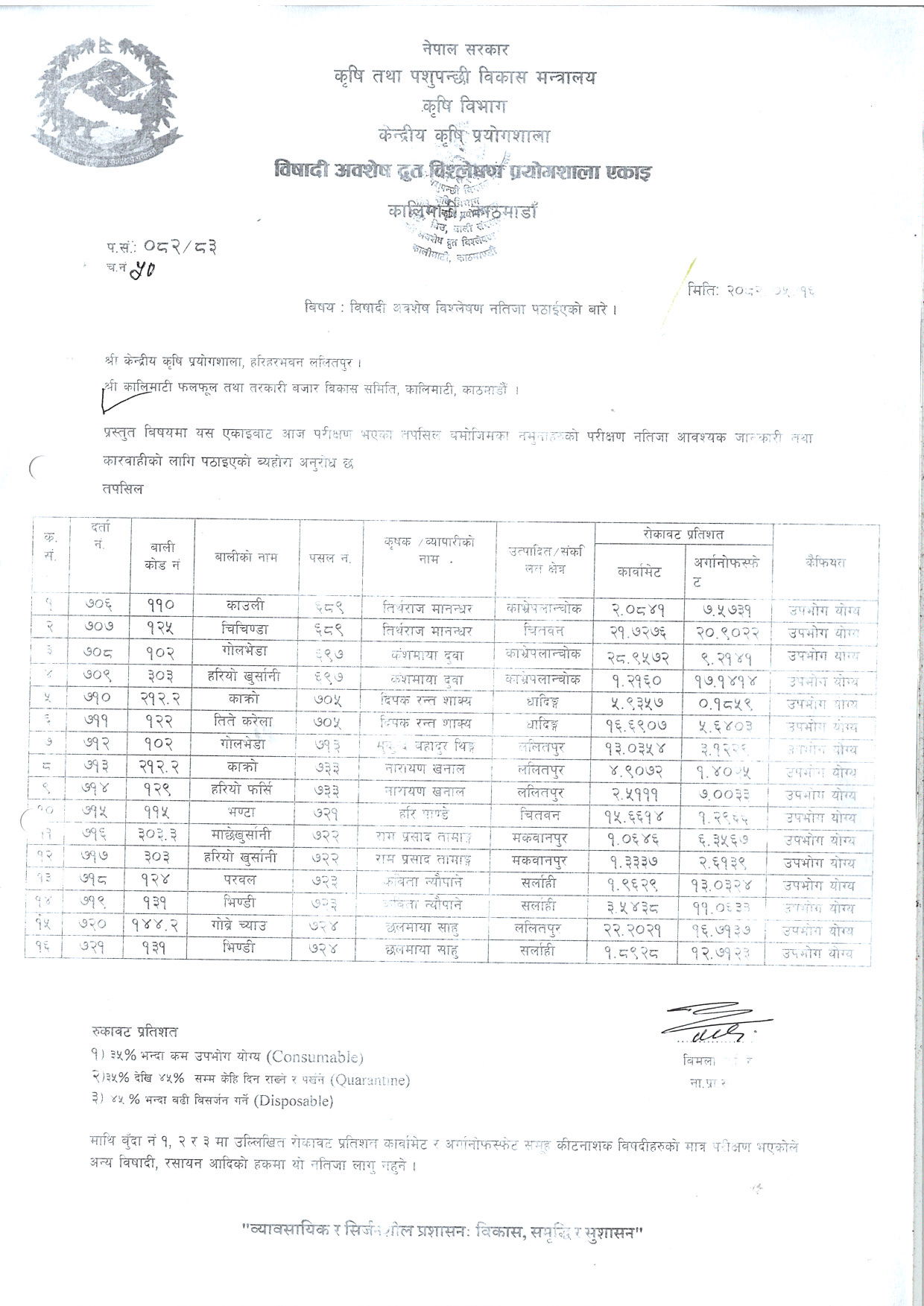 ५४ | विषादी अवशेष द्रुत विश्लेषण नतिजा २०८२/४/२३ | सूचना हेर्नुहोस् | वि.सं. साउन २३, २०८२ | डाउनलोड गर्नुहोस् |