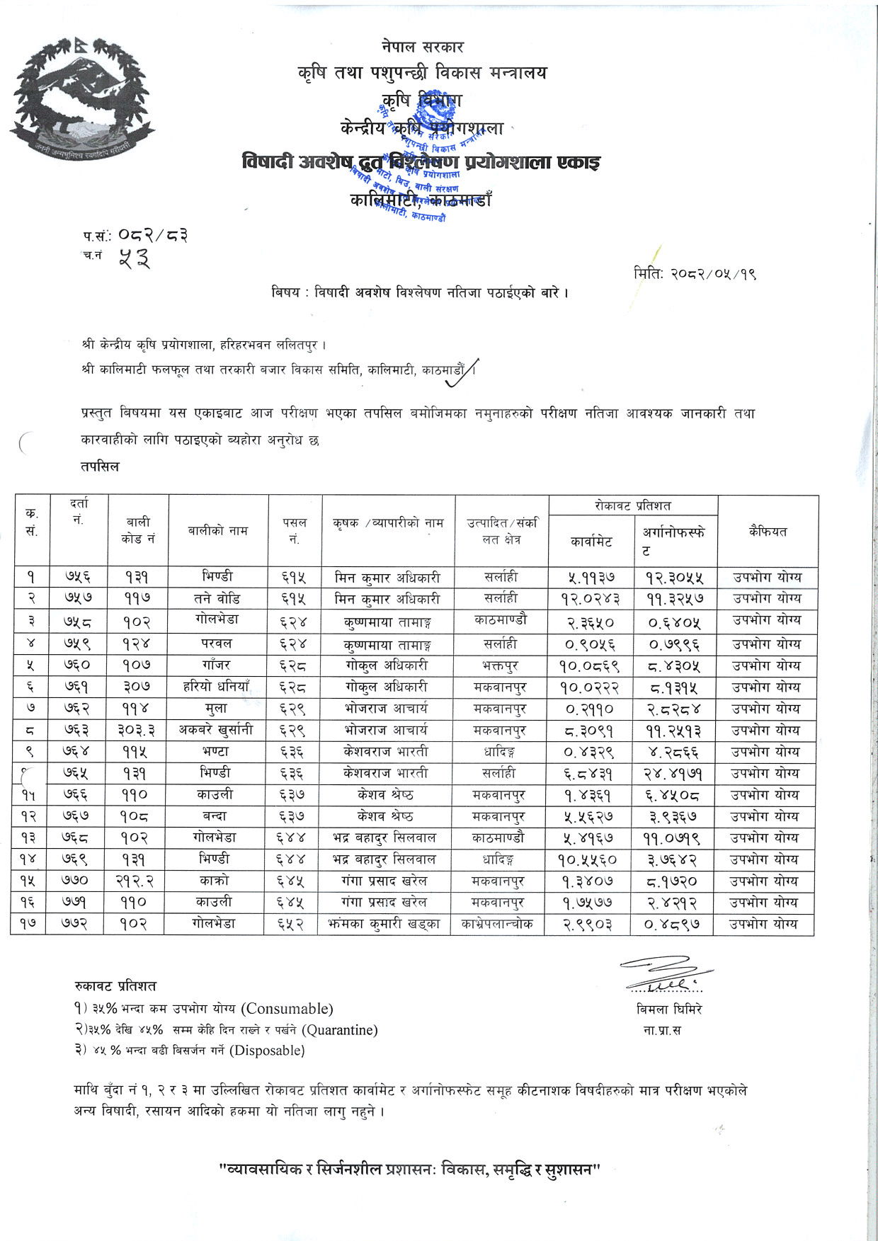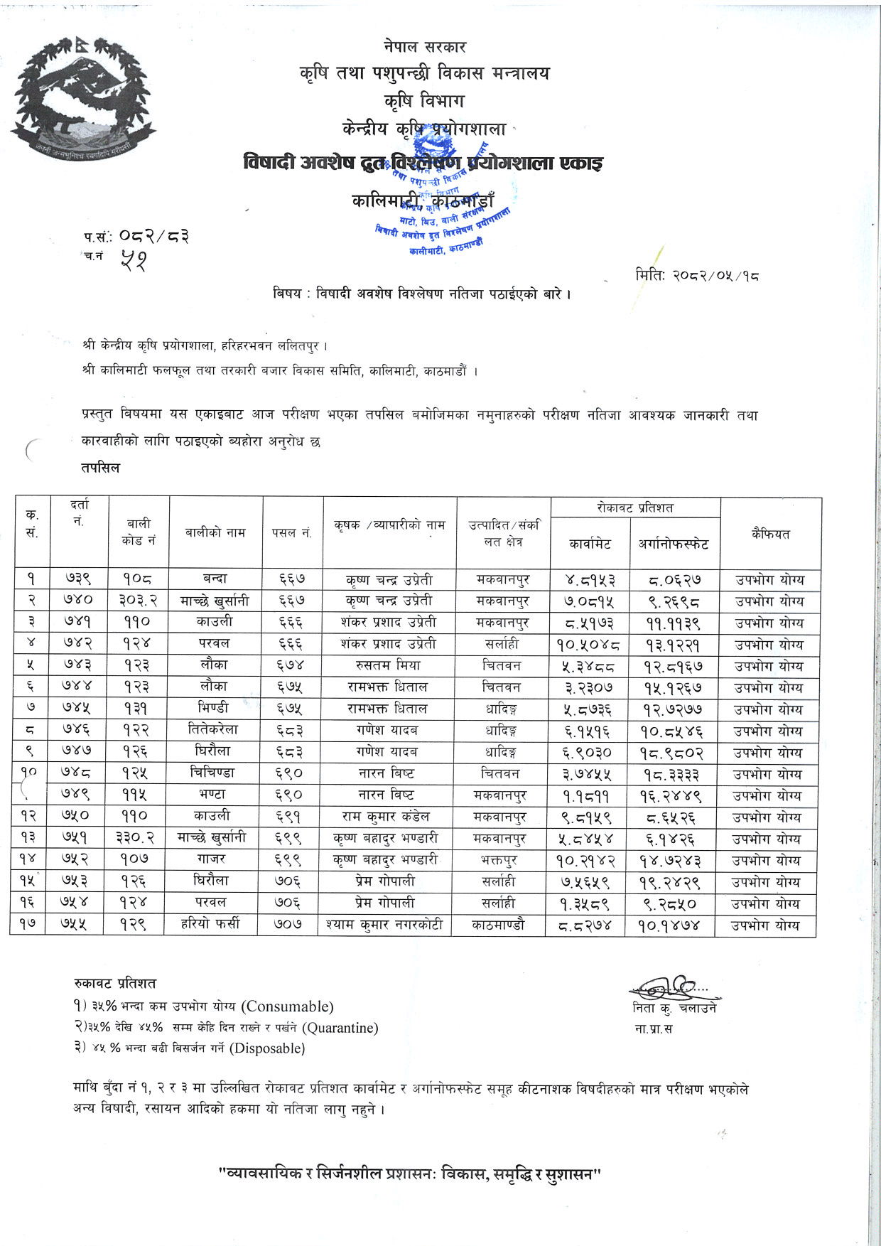 १९ | विषादी अवशेष द्रुत विश्लेषण नतिजा २०८२/६/१ | सूचना हेर्नुहोस् | वि.सं. असोज ०१, २०८२ | डाउनलोड गर्नुहोस् |